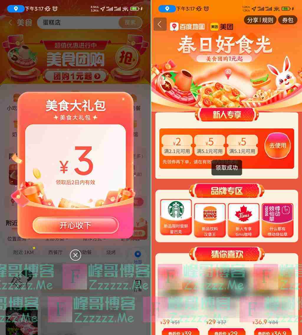 百度地图APP每日领多张无门槛大众点评团购券,新用户可直接领两张满5.1-5元券、2.1-2元券。...