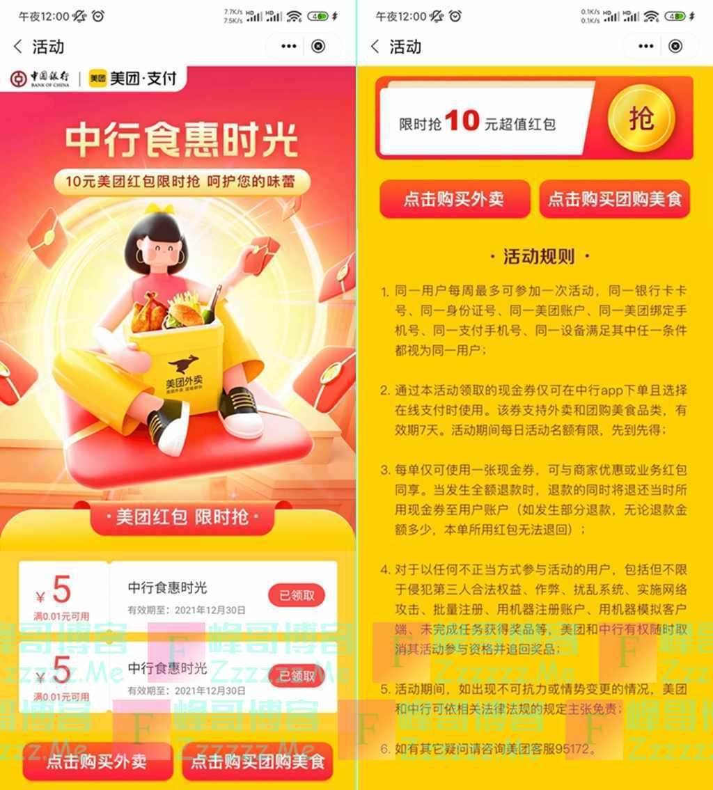 中国银行食惠时光活动领一张美团6元无门槛抵扣券,优惠券领取后有效期为七天,活动每天早上九点开始!...
