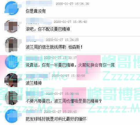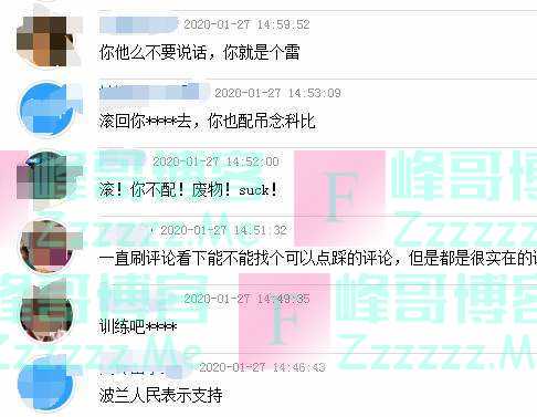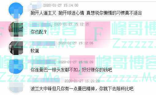 本来一句普通的话,但却激起了一些不和谐的声音。“滚回你****去,你也配吊念科比,滚!你不配!废物!suck!波兰大中锋但凡你有一点曼巴精神,你就下去陪科比吧。”这些话语出现在一个悼念亡者的评论里真的太刺眼。人家周琦当初表现不佳遭到巨大压力时,科比曾给他过鼓励,这时候他感情流露,这样去评论周琦实在太不应该。