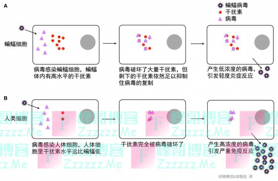 蝙蝠和人体遭到病毒感染时的不同反应,蝙蝠体内高水平的干扰素是关键