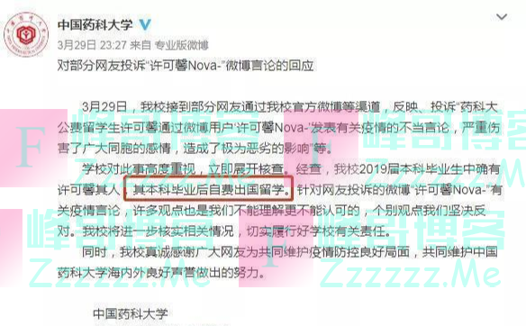 她的母校“中国药科大学”也受到了牵连。估计学校也一脸懵逼,怎么会教出这样的学生?于是,校方连夜发帖,澄清事实:许可馨毕业后自费出国留学。