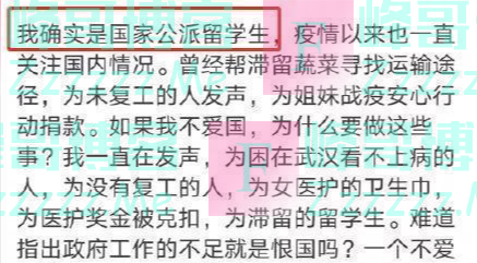 当时有一位留学生出来,就接机一事,劝阻她别出来说话,别给留学生抹黑,但她回应非常偏激: