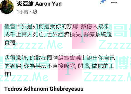 对此,台湾民进党当局外事部门则进行否认,还要求谭德塞道歉。就在台湾和谭德塞之间的冲突不断加深时,炎亚纶突然“杀”出。4月9日,炎亚纶在脸书账号发文指责谭德塞“误导”世界,导致上亿人感染、成千上万的人死亡、经济遭受严重损失、医疗系统超负荷,同时还口出恶言称“你敢说出你个人屎一样的言论,为什么不直接吸它,闭上你的臭嘴,做好自己的工作”。