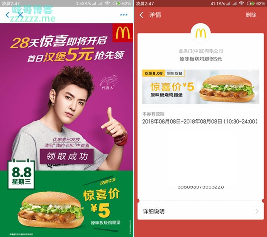 麦当劳 金拱门 5元原味板烧鸡腿堡优惠券+免费雪碧券!》发布于2018-8-3
