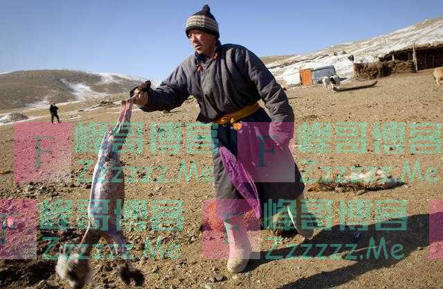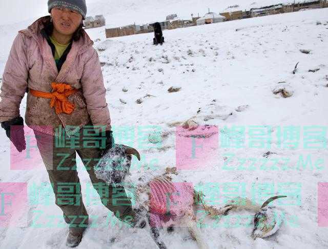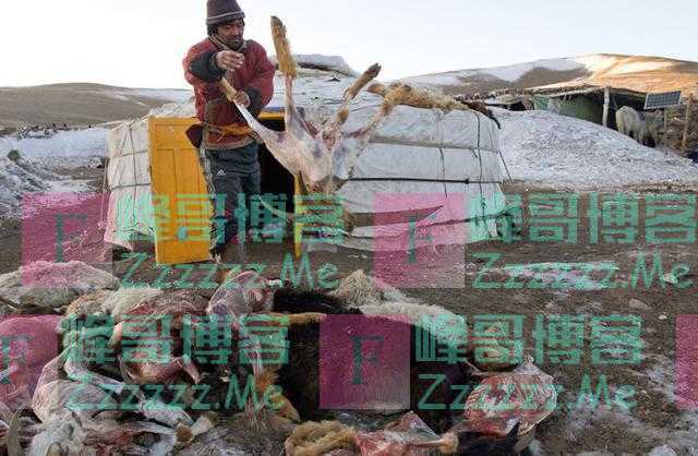 图为牧民Einkhbileg家里1/4的牲畜在雪灾中冻死,蒙古包外随处可以看到死去的牲畜。外蒙西部的人因此而时刻面临被饿死的危险。