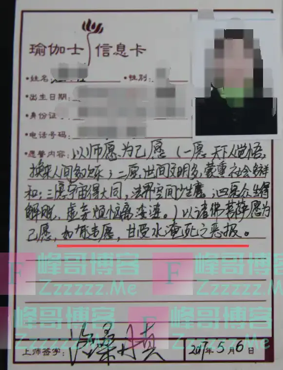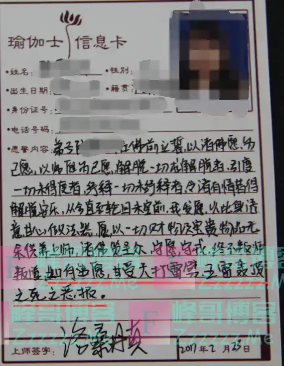 魏某某说,王兴夫歪曲了藏传佛教中“金刚菩提誓言”的概念,把本意是鼓励学佛之人坚定信念、求菩提正道的“誓言”,用来恐吓弟子们,“让弟子害怕,听师父的话,不做背叛他的事情”。他甚至还让信徒们在他制作的“无上瑜伽卡”上亲笔写下这些恶毒恐怖的“誓言”。
