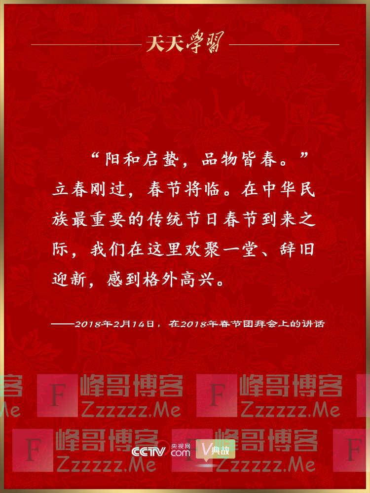 党的十八大以来,习近平总书记多次在腊月二十九举行的春节团拜会上发表重要讲话,盘点旧岁、谋划新年,向全国各族人民、港澳台同胞和海外侨胞拜年,并致以美好的新春祝福。在讲话中,习近平总书记频频引用具有新春节令特点的古代经典诗文名句抒发情怀、畅想未来。这些诗文名句如春风化雨润人心田、暖人心扉,激励着亿万人民在新的一年里追梦前行。