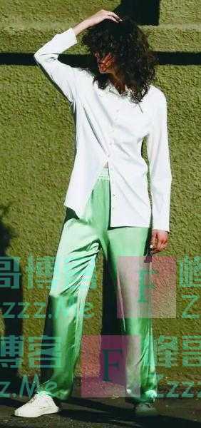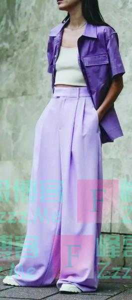 裤长应拖地。因为彩色有视觉膨胀感,大色块的阔腿裤容易显得下半身太宽,化解的办法就是:拉长裤长。无论是低腰还是高腰,可以选择拖地款阔腿裤,最好是刚刚好的踩脚长度,露出有延伸感的尖头鞋,这是打造好身材的关键。
