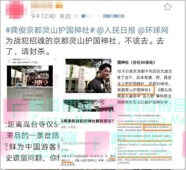 随后,便有人发博要求封杀龚俊,称京都灵山护国神社是为战犯招魂的地方。