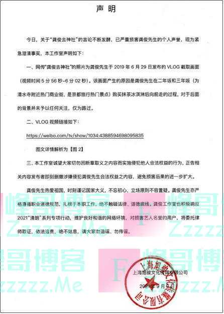 9日下午,龚俊工作室发声明回应“进神社”争议,表示VLOG截取画面中的场景是热门旅行景点,龚俊只是在购买抹茶冰激凌后向前走,对于后面的背景并未予以任何关注,仅为路过。工作室号召:望大家切勿因断章取义之内容而实施侵犯他人合法权益的行为。
