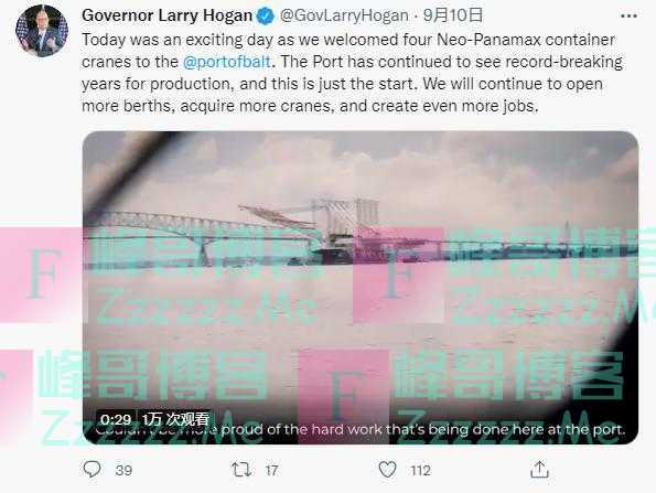 马里兰州州长拉里·霍根的推特关注中国港口设备抵美。图源:twitter