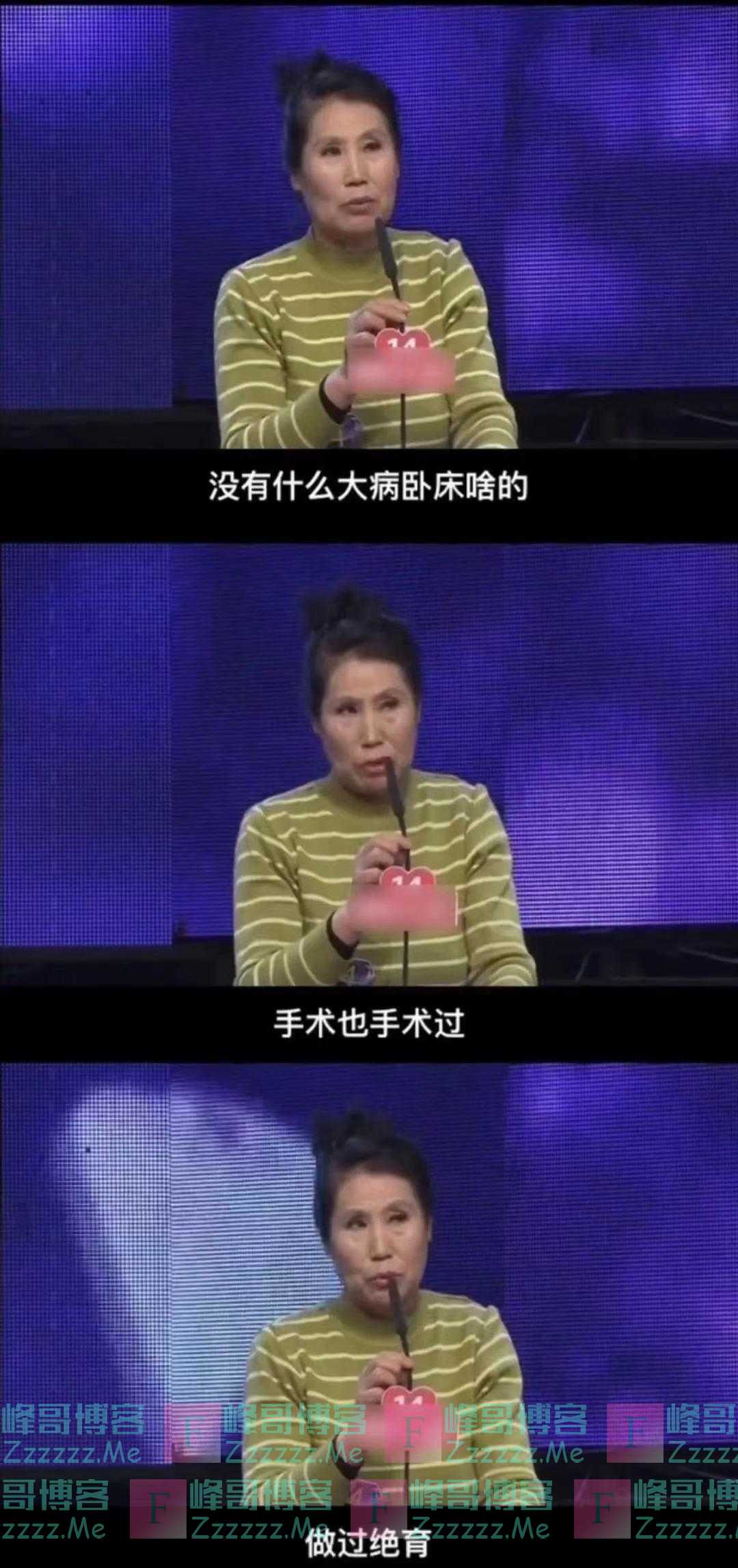 另一位大姨表示,没有什么大病。主持人问,也没做过手术?大姨称:“手术也做过,做过绝育。”