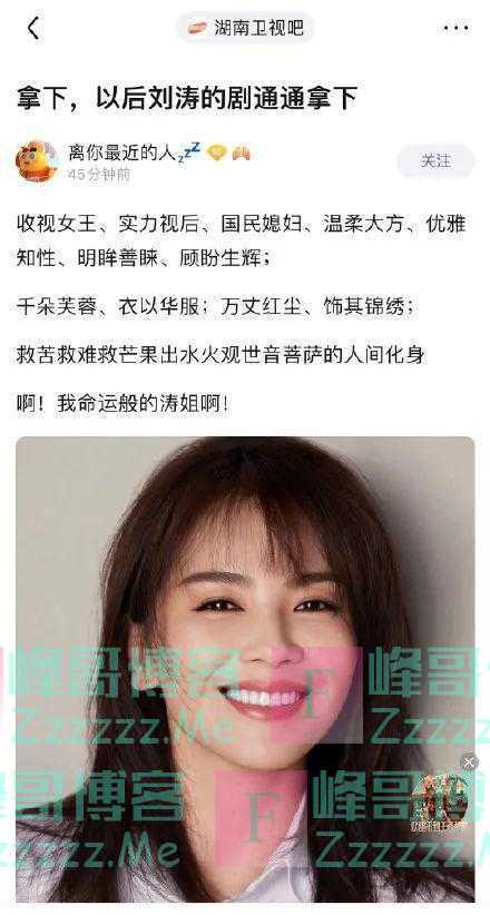 后脚又拯救了湖南卫视颓到地心的低迷收视,主演《星辰大海》,扮演逆袭人生的超强打工女王,收获芒果精(湖南卫视的铁杆粉丝)花式夸赞其“收视女王、实力视后”的一箩筐彩虹屁。