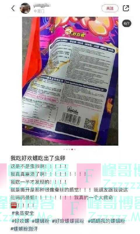 有网友在社交媒体上报料称,在知名螺蛳粉品牌“好欢螺”的食品里吃出虫卵。