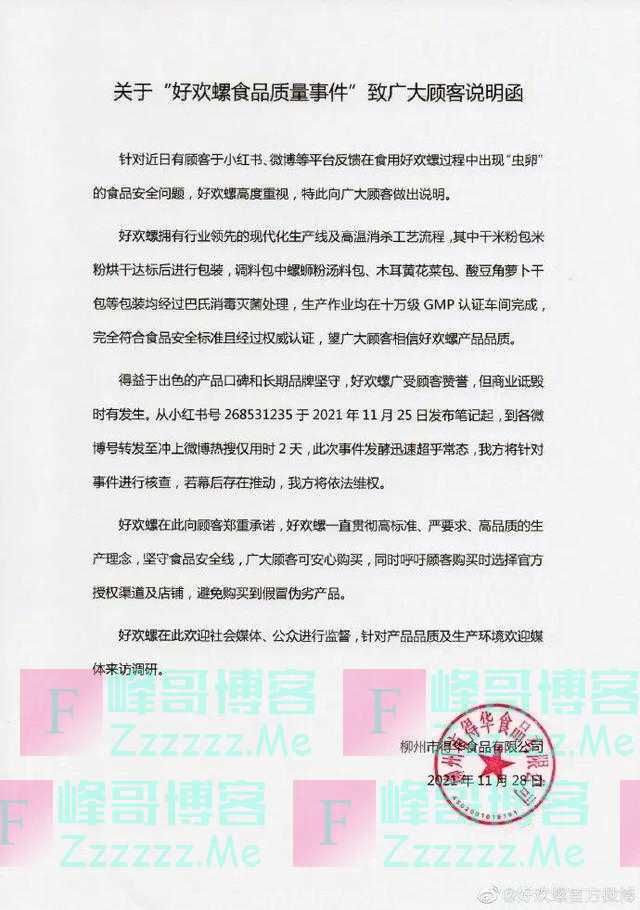 被曝吃出“虫卵”,好欢螺回应》发布于2021-11-29