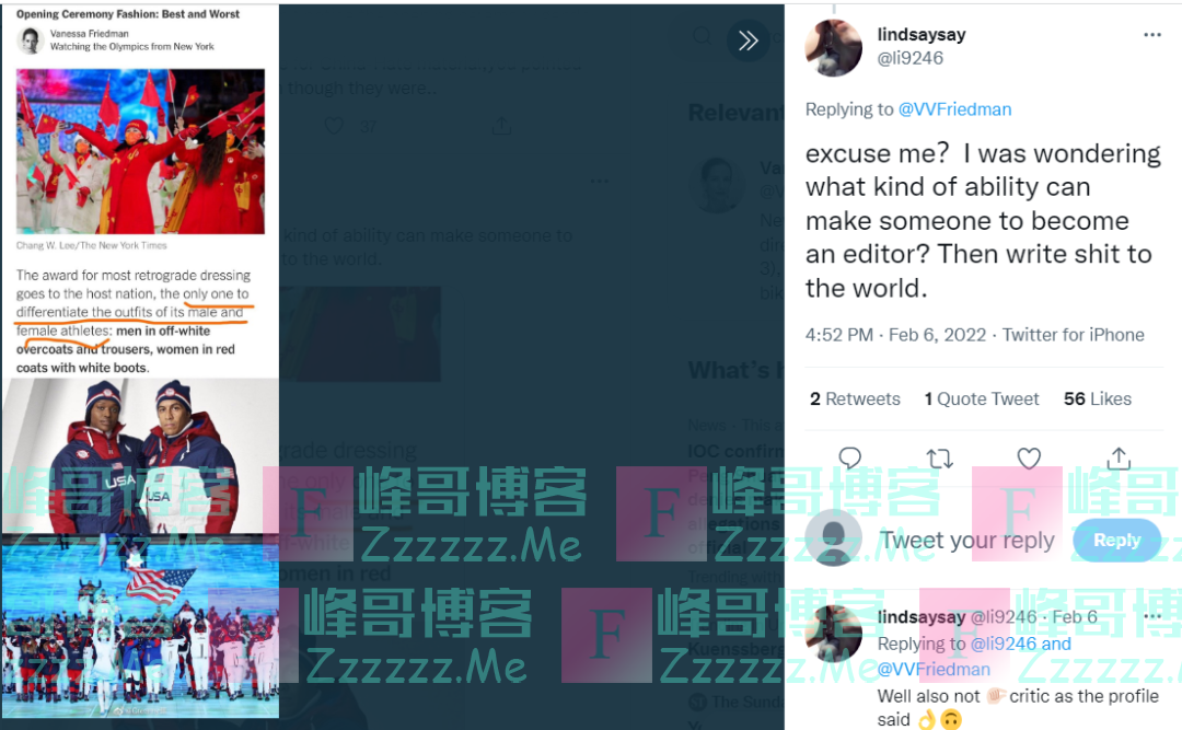 如上图所示,在冬奥开幕式当天,这位名叫凡妮莎·弗莱德曼的主编就以“各国冬奥代表团入场服饰点评”为主题,在《纽约时报》官网上对各国代表团的服装进行点评。这位主编在点评中国代表团入场服装时,语带讥讽地称“‘最大退步奖’要评给这次的东道主”,并称中国是“唯一一个用服装区分男女运动员的国家”。