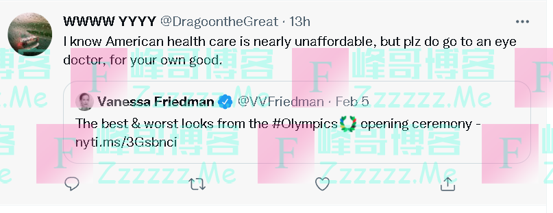 最损的一条评论还联系时事调侃弗莱德曼:“我知道美国目前医疗资源紧张,但请你还是去看看眼科吧,这是为你好。”