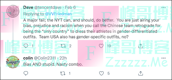 结合这两段文字看,弗莱德曼对中国代表团服饰差评的原因是在“男女运动员服装不同”和“性别差异”上,尤其是“中国唯一”这个点更是让她气愤不已。结合她曾以“女性主义”点评另一个奢侈品广告的过往推文看,弗莱德曼显然是想从“男女平等”这个角度批评中国了。