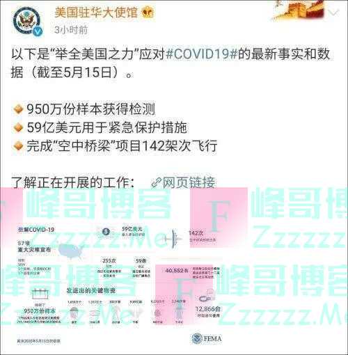 5月18日,美国驻华大使馆在其官方微博公布了美国“举全国之力”应对新冠肺炎的一些数据。其中包括截至5月15日,美国的新冠...
