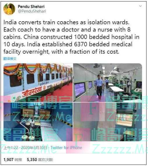 有个印度博主在推特上说,印度把火车车厢改装为了隔离病房,每节车厢配备了1名医生,1名护士,以及8个小房间。她还和中国做了...